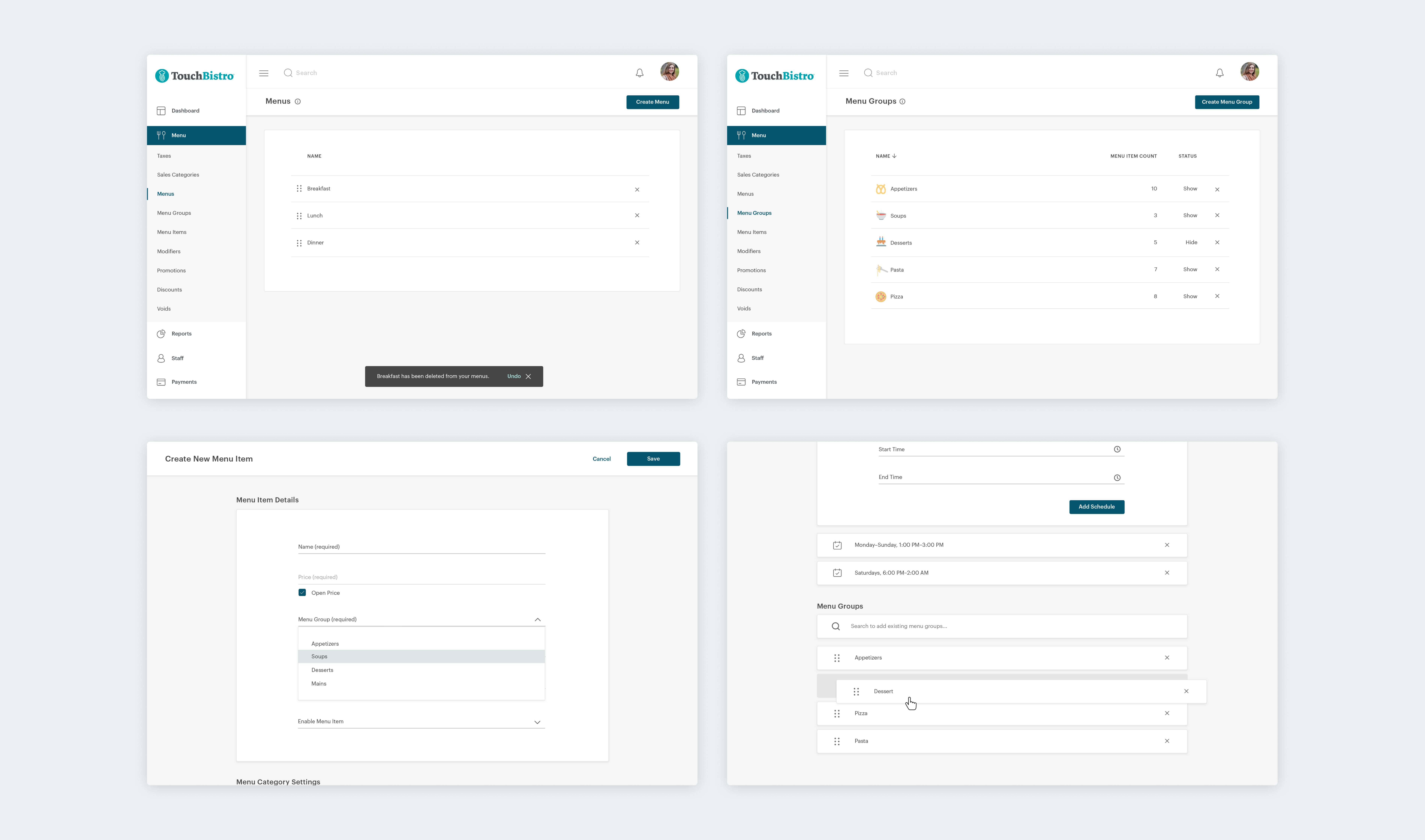 TouchBistro's restaurant management program is a cloud-based web app that houses all the information required for a restaurant owner or manager to run their business. This project was twofold; the product team wanted to give users the ability to create their menu while not physically being in the restaurant. The second part was to create the ability for enterprise restaurant businesses with multiple restaurant locations to be able to create and edit their menus.