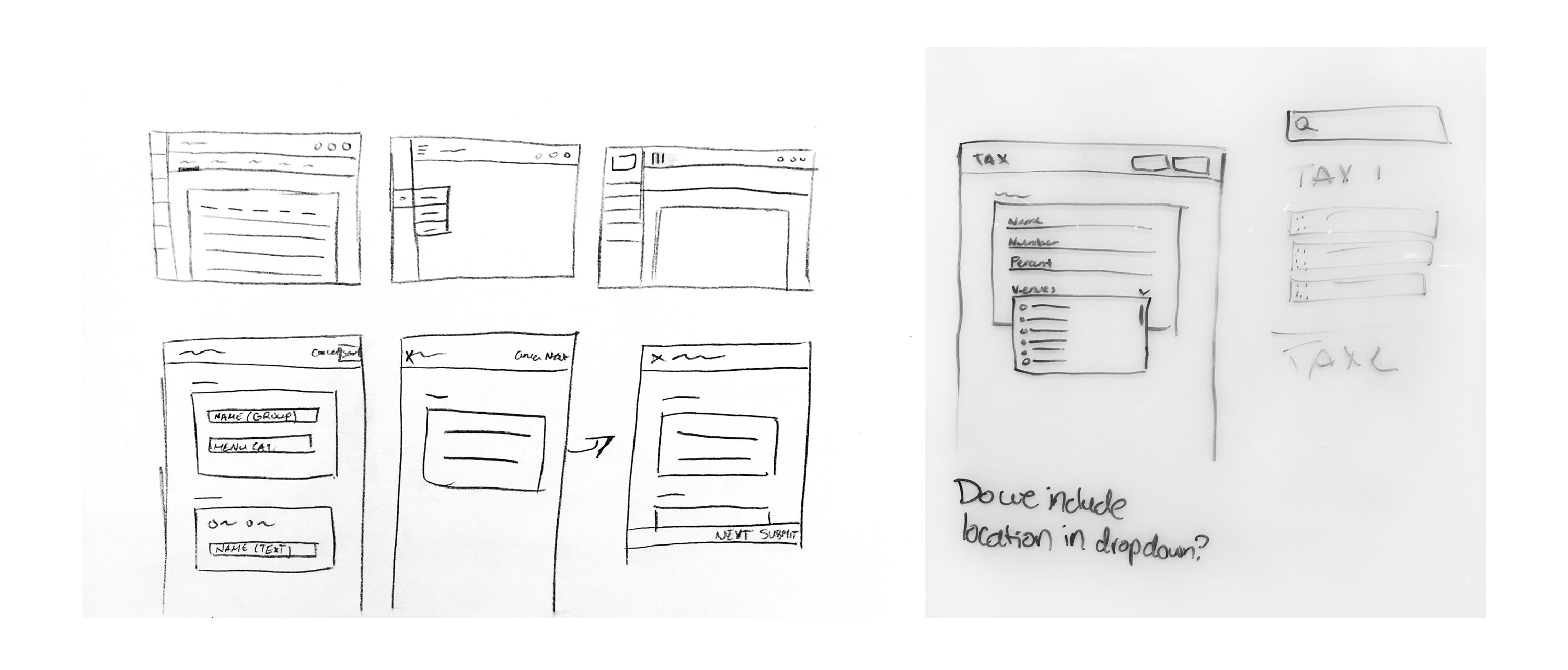 I created wireframes for the skeleton of the product, the tables, and the forms. If any new or confusing features came up throughout the project, my coworker and I would resort to drawing our ideas on a whiteboard. But this is mainly something that we did on and off throughout the project due to unforeseen scope.